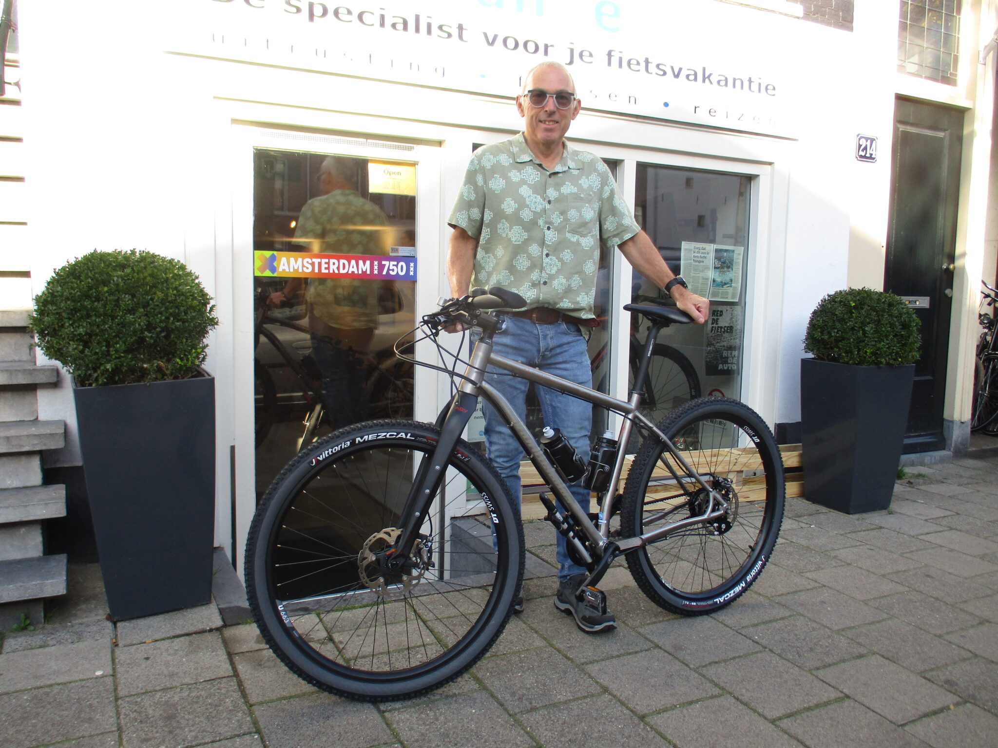 Jan is niet van suiker gemaakt, hij is namelijk gewoon heerlijk in de regen terug naar huis gaan fietsen. Op zijn titanium Van Nicholas Pioneer kan een beetje water geen kwaad. Plannen heeft hij ook al; hij gaat met de camper naar Zwitserland en daar fietsen.