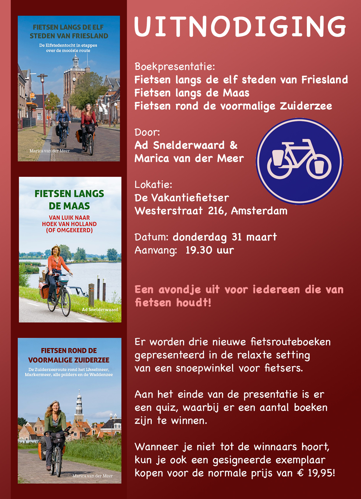 Komende donderdagavond vertellen Marica van der Meer en Ad Snelderwaard over hun nieuwste routes: de Elfstedentocht, Maasroute en Rondje Zuiderzee. Inclusief kwis! Graag vooraf aanmelden.