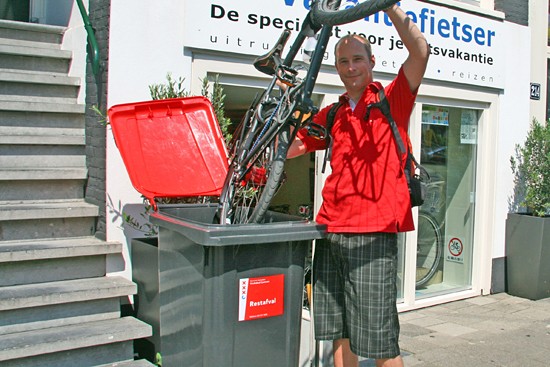 De Santos van Kurt. Tja, een van de sjiekste fietsen van het jaar en dan in de Restafval-container?