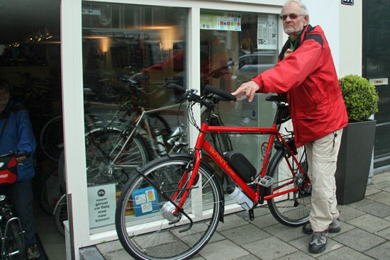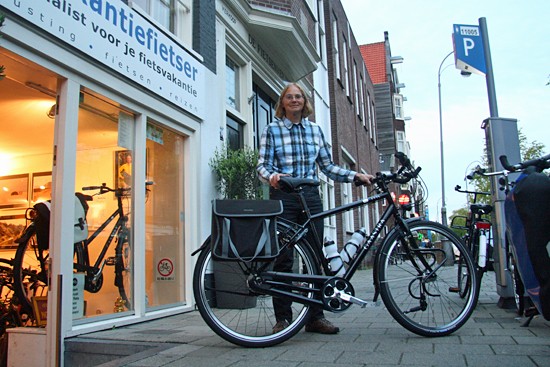 Pim met een fiets die eigenlijk te licht voor ons is (Deze idworx Rapid One weegt nl. 8,4 kilo).