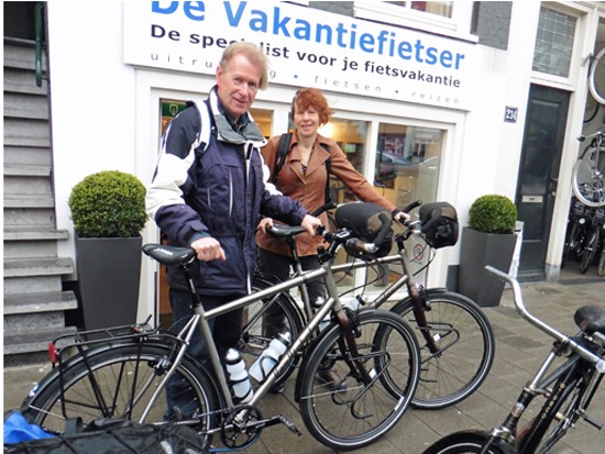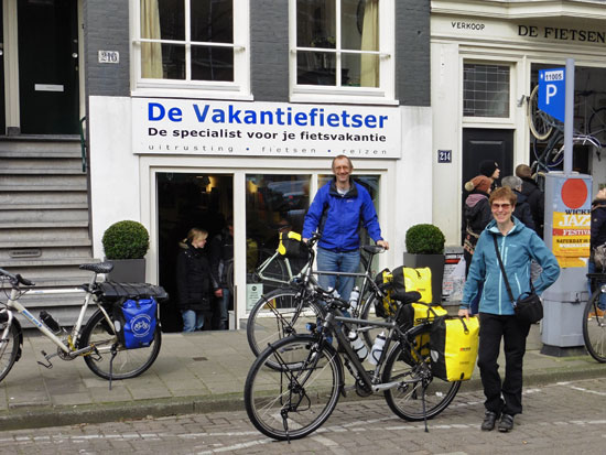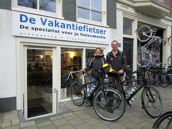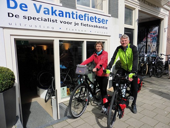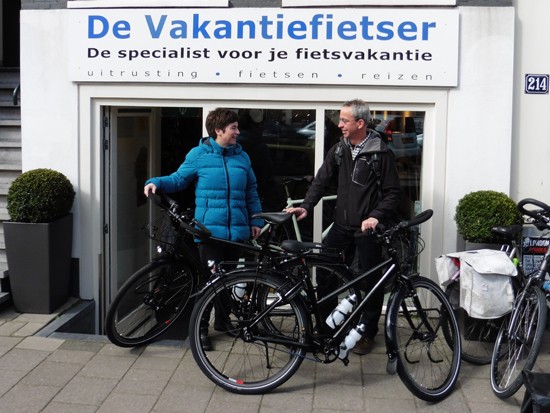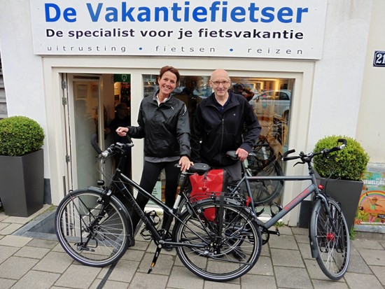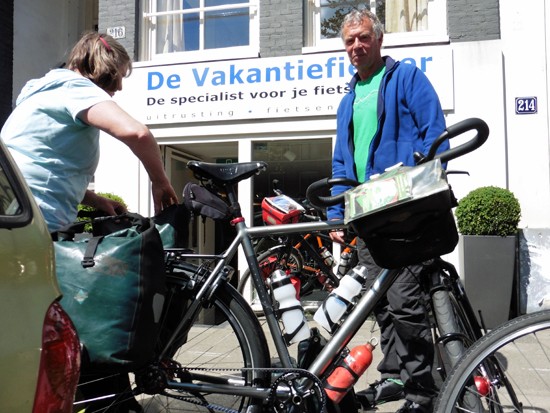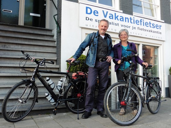 Co en Linda met een Santos Travelmaster (kijk eens naar de rode letters:-)) en een Koga Signature. Ik ben altijd blij als een stel niet dezelfde fiets, tassen en jassen heeft. Alhoewel…