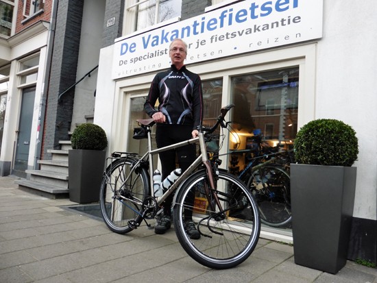 Hans met een titanium Van Nicholas Pioneer. Met de mooiste fietsbel die er bestaat.
