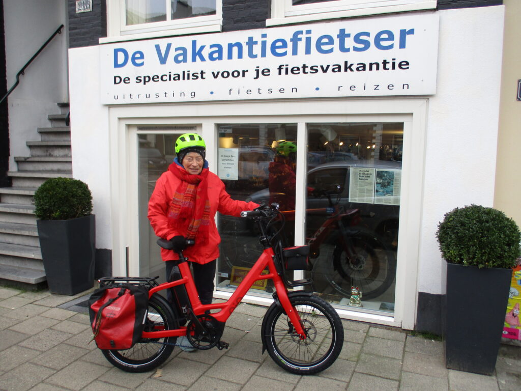Francoise fietst op haar Qio met Bosch, Shimano en riem op haar 80e nog door heel Europa. Stoer! (Haar felgroene Tout Terrain heeft zij ook nog steeds hoor)