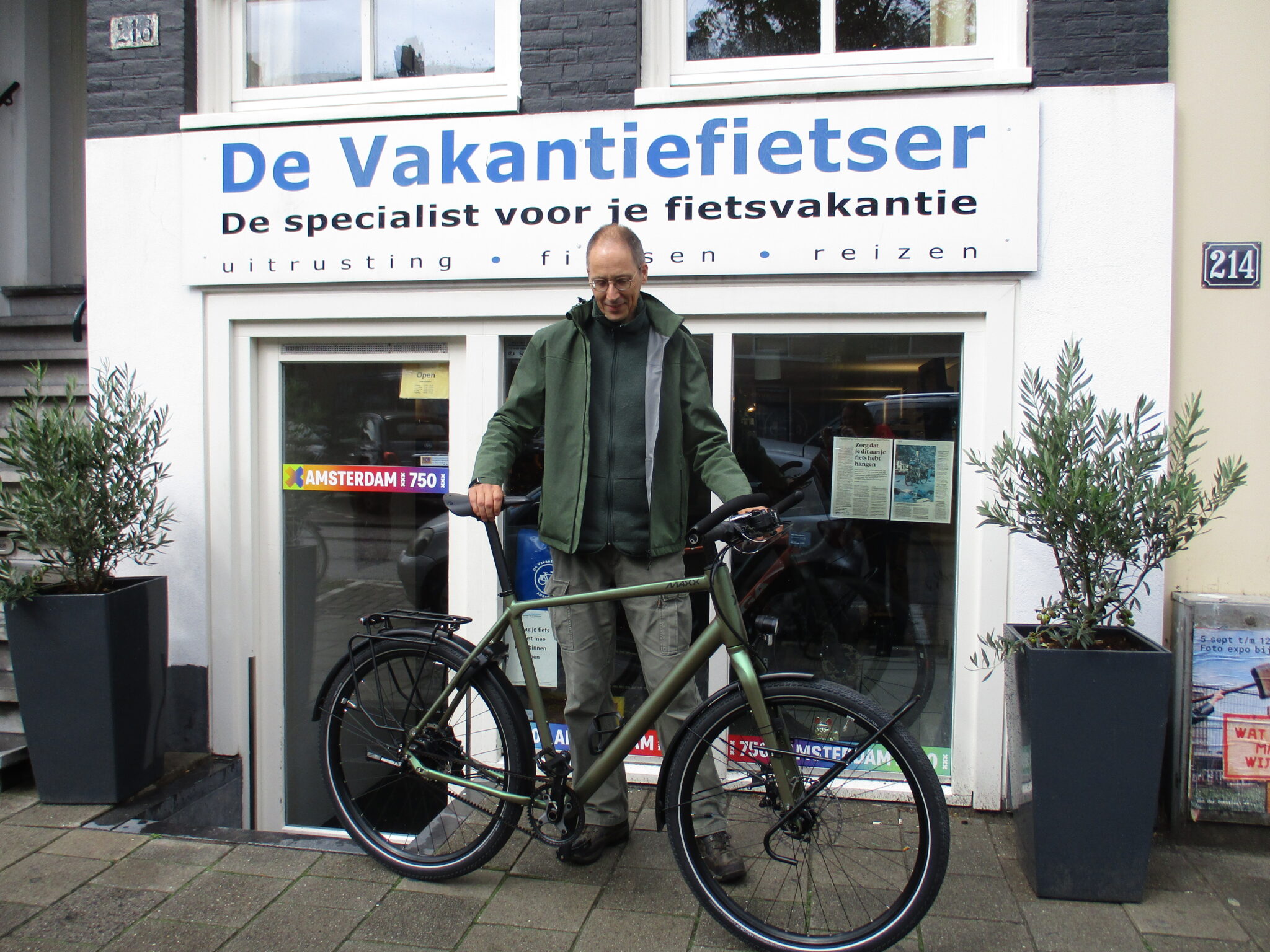Hier zie je René met zijn mooie nieuwe Koga Worldtraveller Classic in de kleur Pine Green.