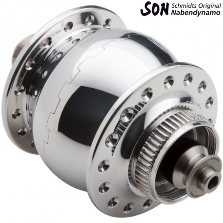 Als eerste is er de SON, de beste naafdynamo die we hebben. De SON dynamo’s zijn verkrijgbaar in vele kleuren, hebben verzilverde stekkers, een condensatiespiraal, slijtvastere onderdelen dan bij de Shimano naafdynamo en 5 jaar garantie. Bovendien kunnen de SON dynamo’s zowel met een steekas als een snelspanner worden uitgevoerd. Ook biedt SON de optie voor een stekkerloze aansluiting, wat veel gedoe scheelt met fragiele draadjes.