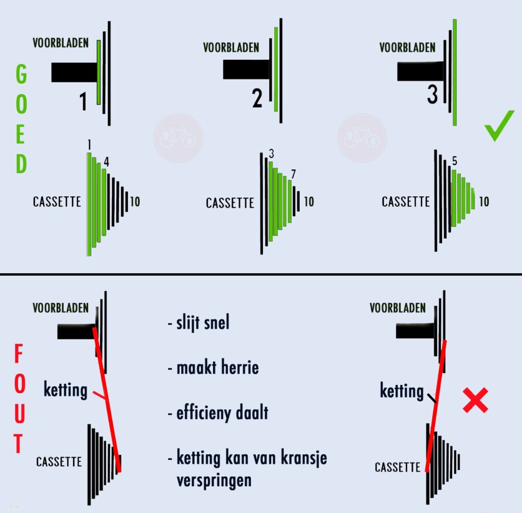 Je kunt slijtage wat beperken door bewuste schakelstanden te hanteren. Op het plaatje kun je zien hoe het hoort. Dus ligt de ketting op het voorblad met nummer 1, dan mag je achter alleen de vier achterkransjes aan de linkerkant gebruiken. Gebruik je het middelste voorblad, dan mag je alleen de middelste kransjes op je cassette gebruiken.
