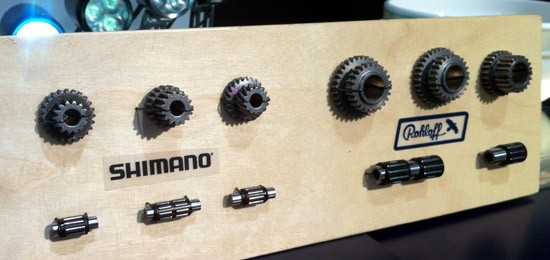 Kransjes van Shimano-versnellingen vergeleken met kransjes van een Rohloff-naaf. Foto door Sint Christophorus.