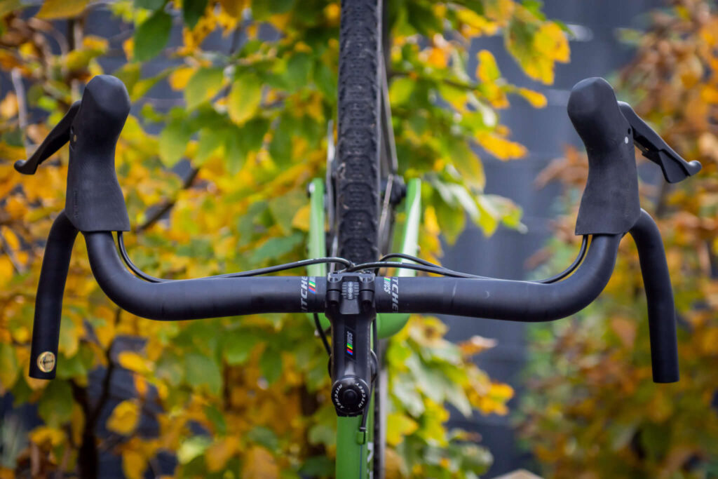 Een van de punten die opvalt, is het vorm van het stuur. De sturen op gravelbikes hebben meestal een aantal graden flare; dan wordt de greep in de beugels breder voor meer controle met bagage en op technisch (onverhard) terrein en bovendien geeft dit wat meer breedte waar de stuurtas zelf tussen past zonder dat dit het schakelen in de weg zit.