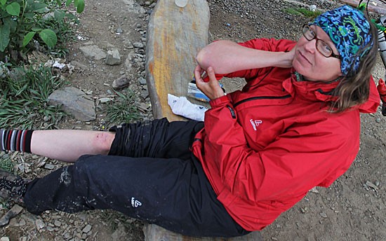 Snel trekken we onze regenpakken aan en stuiteren verder naar beneden. Gelukkig wordt het later op de dag wel weer droog, en genieten we weer van de uitzichten, maar doordat de weg nat is glijd ik op een zeker moment weg en val. Gelukkig is het net een breed stuk, en heb ik m’n regenpak nog aan, wat de schade enigszins beperkt.
