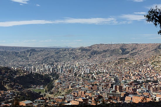 De stad El Alto omringt de kom waar La Paz in ligt. Als we stilstaan op de rand zien we vierhonderd meter onder ons in de diepte de Boliviaanse hoofdstad liggen. Ingeklemd in de kom van de omringende bergen ligt een miljoenenstad bestaande uit een wirwar van straatjes, wegen, huizen met in het midden een handvol indrukwekkende wolkenkrabbers.