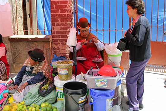Betonnen gebouwen, koloniale panden en vervallen krotten staan zij aan zij in de straten. Het lijkt wel alsof iedereen hier iets probeert te verkopen. Een Boliviaanse vrouw met bolhoed zit al de hele dag voor ons hotel om vanaf haar kleedje wat zelfgemaakte portemonnees te verkopen. Ondertussen is ze onafgebroken aan het breien. Een slonzig geklede man benadert mij en wil mij voor tien duppies een fossiel van een triboliet verkopen. Een moeder met dochtertje heeft pannetjes om zich heen staan en verkoopt maaltijden bestaande uit rijst, kip en wat aardappels. Zij doet goede zaken, maar ik wordt er stil van als ik mij realiseer dat de meeste straatverkopers zelden iets verkopen. Soms lijkt het wel alsof ze ieder vrij plekje gebruiken om hun waar uit te stallen. Een nis tussen twee gebouwen is opgevuld met een tafeltje met daarop appels. Een portaal van een verlaten bouwval is versierd met geweven doeken in typisch Boliviaanse motieven van vijf euro per stuk.