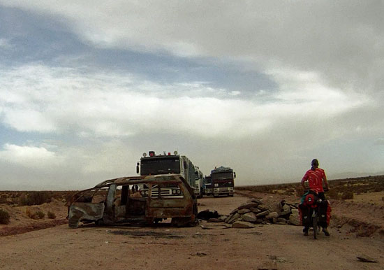 Achter de zwartgeblakerde bus ligt de grens met de provincie Potosí, want een stuk of twintig vrachtwagens in een dubbele rij opgesteld, staan daar te wachten. We stoppen en lopen met de fiets in de hand naar een groepje mannen. Ik voel mij nog steeds niet bang en voel zeker geen dreiging, dus maak een praatje.