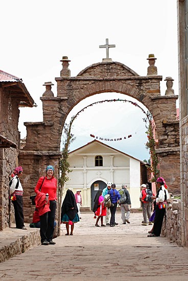 Het eiland ligt ruim twee uur varen vanuit de baai van Puno. Als we eindelijk wiebelig weer aan land staan worden we door gids Juan in veertig minuten over het speciaal voor de toeristen aangelegde pad in colonne met de toeristen van de andere zeven boten naar de top van het eiland gedirigeerd waar het enige dorpje van het eiland ligt. De trap met treden die er sinds mensenheugenis lag, was te zwaar voor sommige toeristen, dus is er nu een pas. Boven aangekomen krijgen we tien minuten om het centrale plein en het daaraan gelegen handwerkcentrum te bekijken. Dan wordt ons een lokaal huis gewezen waar een lunch is bereid die twintig Soles kost. Na de lunch worden we naar de andere kant van het eiland geleid om vervolgens weer aan boord van de boot te worden gehesen.