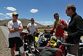 Behalve een eenzame japanner die Spaans nog Engels spreekt, zijn drie jonge Fransmannen de eersten die we tegenkomen op deze reis. Zij vormen Les Trois Petits Guidons (www.3petitsguidons.com). Na hun studie economie zijn de drie vrienden op de fiets gestapt met, heel dapper, vrijwel geen fietsreiservaring en nagenoeg nul komma nul kennis van fietsen. Ze zijn van plan om in één jaar letterlijk de wereld rond te gaan. Daarbij vragen ze aandacht voor een 200-tal micro-financieringsprojecten. Ze zijn nu ongeveer twee maanden onderweg.