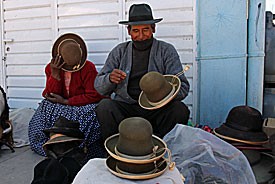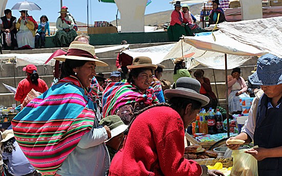 Juan, onze gids op Taquile en de Uros eilanden, had ons verteld van deze markt. Volgens hem gaan de mensen van de Uros eilanden hier elke zondag naartoe om hun producten te ruilen met producten die ze zelf niet kunnen verbouwen. Volgens Juan komt daar geen geld aan te pas, maar dat kunnen wij niet beamen. Wij kunnen aankopen zoals fruit, kruiden en een typisch Peruviaans bolhoedje gewoon met Peruviaanse Soles betalen.