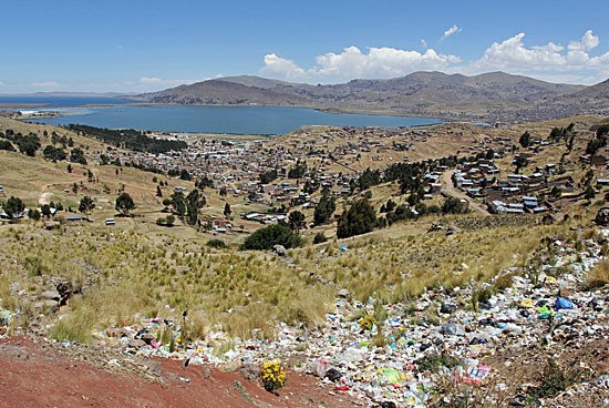 De lijklucht, de drukte op de weg, de lelijkheid van de stad Juliaca en de buitenwijken van Puno, bederven wat ons betreft een stuk van deze mystiek. De vuilnisbelt op de pas waar we voor het eerst het Titicacameer kunnen aanschouwen, maakt het er al niet beter op.