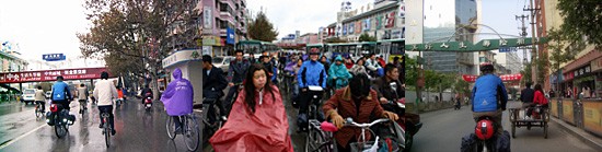 In de straten heerst een gezellige bedrijvigheid. Groenteverkopers klimmen op grote bergen Chinese kool om er een paar af te pakken. Een slager heeft grote lappen vlees uitgestald die op een bakfiets liggen. Midden op de weg staat een fiets op zijn kop. Een fietsenmaker is de achterband aan het plakken. Zijn gereedschap bevindt zich in een houten kastje naast hem. Een schoenmaker wacht nog op klanten. Hier en daar staan groepjes oude mannen, gekleed in Mao-jasje plus pet, op hun gemak te praten.
