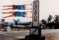 Bij het plaatsje Bonjol passeren we de evenaar. Wat is het in drie jaar tijd veranderd. Toen stond midden in het landschap aan de ene kant van de weg een paal met ‘equator’ erop en aan de andere kant een aardbol. Dat was alles. Nu is er een heel dorpje verrezen met enkele grote gebouwen. Hoog boven de grenslijn bevindt zich een loopbrug. Als we afstappen om foto’s te maken, komen meteen een paar verkopers op ons af met T-shirts waarop ‘equator’ en een aardbol staan. Onder grote belangstelling zetten we mijn fiets ondersteboven. Na ruim dertien maanden bevinden we ons immers op het zuidelijk halfrond. Na het afstellen van de zelfontspanner gaat Eric op zijn hoofd staan. Hij zwabbert vervaarlijk met zijn benen en ploft al na twee seconden op de grond, maar de foto is genomen. De omstanders schudden van het lachen. Omdat we er ook een dia van willen hebben, kondigt Eric opgewekt aan ‘second time.’ Iedereen verkneukelt zich al bij voorbaat. En ja hoor, daar gaat hij weer. Wat een gekke toeristen.