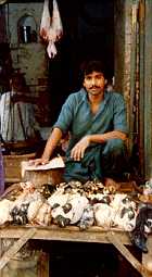 Eenmaal weer buiten bezoeken we een bazaar. Deze bestaat uit smalle straatjes met talrijke winkeltjes, waarvoor huishoudelijke artikelen en heerlijk geurende kruiden in grote zakken op straat zijn uitgestald. Op de dierenafdeling wemelt het van de kooitjes die slordig naast en op elkaar zijn gestapeld. Het geheel doet denken aan een flat, maar dan voor dieren. Een vogel heeft een konijn als linker- en een aapje als rechterbuurman. Boven hem woont een hond met pasgeboren jongen en onder hem een poes. Het is een gekwetter en gepiep van jewelste. Ook zijn er levende kippen, die een man op een weegschaal legt. Ernaast liggen hun gevilde soortgenoten, met de kop er nog aan. We lopen gauw door, want het is een erg onsmakelijk gezicht. Dit is echter nog niets vergeleken met de vleeshal, waar grote stukken rauw vlees aan haken hangen. Het stinkt er enorm en het krioelt van de vliegen. Wie dit ziet, wordt op slag vegetariër.