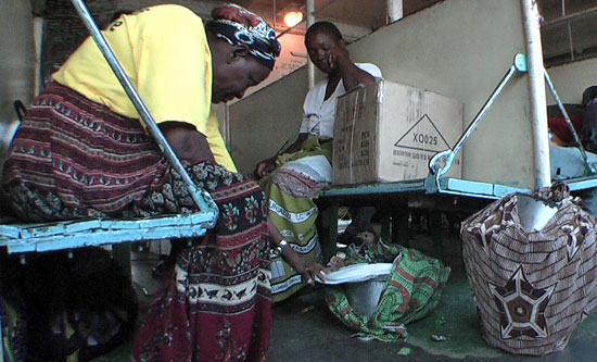 We staan om vijf uur op. Nog voor zes uur duwen we onze fietsen over het tot mul zand verworden pad van het beachcamp Chitimba naar de hoofdweg. Sommige souvenirverkopers zijn hun waren al aan het uitstallen en afstoffen. Er zitten mooie houtsnijwerkjes bij.
