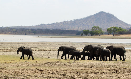 En dan ineens zijn ze er. Eerst zien we ze uit het bos aan de overkant van het meer komen: de machtige Afrikaanse olifanten. Ze lopen loom, de insecten wegjagend met hun wapperende oren. Ze komen steeds dichter bij terwijl ze drinken, een modderbad nemen, zichzelf schoonspuiten met water en daarna met zand. Steeds is de kudde in beweging. Ze lopen vlak voor onze veranda langs, op nog geen honderd meter afstand. Ze blijven nog een tijdje onder de bomen in de verte hangen.