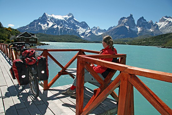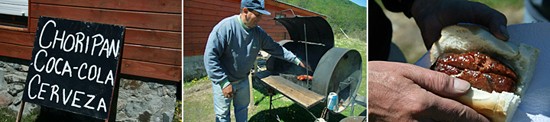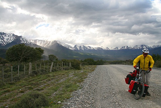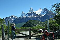 Chili en de indrukwekkende Carretera Austral laten we achter ons. We rijden de fietsen van de boot af en het eerste dat we zien is een hek waarachter een ’trail’ naar een gletscher begint. Een Argentijnse ondernemer staat er met een omgebouwd olievat, waarin hij Chorizowortjes barbecuet. Voor tien Argentijnse Peso koop ik een ‘Chori-pan’ en het smaakt uitstekend. We fietsen onder een strakblauwe hemel met een westenwind in de rug. Rechts staat de Fitz Roy. Een geweldig mooie berg die ver boven het landschap uittorent. We besteden aardig wat tijd aan fotograferen en filmen. Het is naar onze huidige normen een drukke weg. Zeker een keer per half uur rijdt er een auto voorbij. Vaak zijn dat kleine Suzuki’s of grote campers die gehuurd zijn door toeristen. We zien ook de eerste touringcarbus.