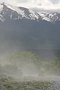 De derde dag vertrekken we vanuit Villa Cerro Castillo en wordt de Carretera onverhard. We moeten het dal uit en beginnen met een pittige klim. De keien en grind schieten onder mijn achterwiel weg. Ternauwernood weet ik mijn schoenen los te klikken en m’n voeten op de grond te zetten. Ik zet mij af en probeer weer weg te rijden. Na twee rondjes trappen, blaast een heftige rukwind mij zowat omver. Het is alsof alle winden zich hier op deze ene helling verzameld hebben om ons het fietsen onmogelijk te maken. De wind komt recht van voren en er zit niets anders op dan te gaan lopen. Het doet pijn. Niet zozeer in mijn eergevoel, maar wel in mijn gezicht. De wind neemt los grind mee en mijn gezicht wordt gezandstraald. “. . . verdomme, dat doet pijn!”, vloek ik het uit. Ik doe mijn kiezen op elkaar, voel het zand er tussen knarsen, en zet door. Ik leun schuin tegen mijn bar-ends en gooi mijn volle gewicht er tegenaan. Zo, weer twee meter gewonnen.