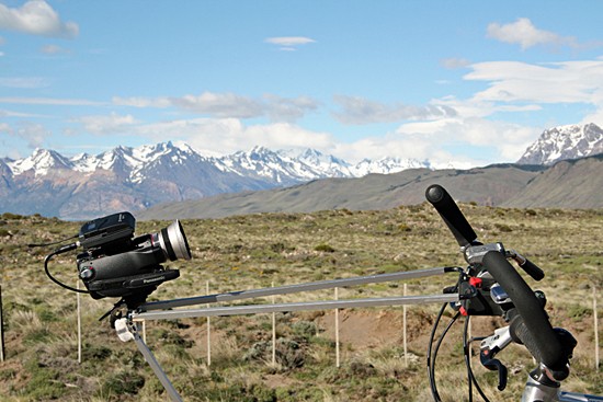 Maar het is een experiment, dus het mag mislukken, hetgeen weer ontspanning met zich meebrengt. En ik breng een indrukkwekkende hoeveelheid spullen mee naar Patagonie: een grote professionele en een kleine camcorder, een stuk of vijf microfoons, allerlei kabels, drie portable harddisks, een notebook, twee portofoons, zeven geheugenschijfjes, negen accupacks en drie laders, een goed camerastatief met een goede draaikop, een statief voor boven het voorwiel, een camerastatief voor op het stuur en op mijn helm kan ik ook een camera schroeven. “Hé, je lijkt wel een Teletubbie!” lacht Carla.