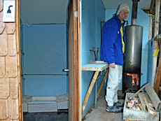 Hoe werkt het: je laat het vat boven de kachel vol met water lopen. Dan steek je de kachel aan en kun je rustig iets anders gaan doen, bijvoorbeeld eten koken. Na ongeveer een uur is het water warm genoeg om allebei een behoorlijke douche te kunnen nemen. En er is zelfs nog water over voor de afwas.