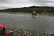 Ik trek mijn lange broek, schoenen en sokken uit en loop met de eerste twee tassen de rivier in. De kiezels zijn niet lief voor mijn voetzolen en de temperatuur van het water laat ook te wensen over. Maar ja, je moet toch wat.