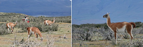 Onderweg hebben we al een paar guanaco’s gezien en gefotografeerd, maar hier lopen héle kuddes. Je kunt ze van heel dicht bij fotograferen. Eric gaat er zelfs tussen fietsen om filmopnames te maken. De bustoeristen krijgen slechts een paar minuten. We voelen ons zeer bevoorrecht als fietstoerist volkomen vrij te zijn.