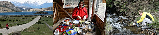 “Voor de grap nog die potkacheldouchecamping opgezocht. Het was een CONAF camping op een dagafstand fietsen van Coyhaique in Parque Nacional Cerro Castillo. Met lekkere schuilhutjes en picnickbanken, wat bij ons geen overbodige luxe was want het was erg koud en de wind ging flink te keer. Je zit daar op ongeveer 1100 m hoogte. Ik ben benieuwd als jullie er komen of het je lukt een warme douche te krijgen. Je moet met zo’n potkacheldouche wel wat geduld hebben…”.