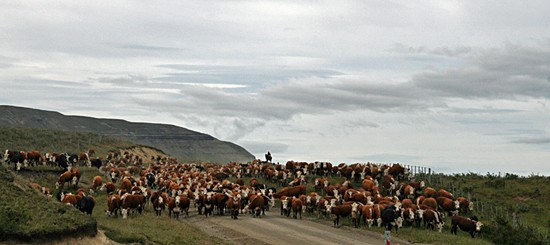 Een gaucho wurmt zich met paard en al door de grote kudde heen en geeft met een stevig stuk touw de voorste koeien een aantal meppen.