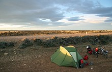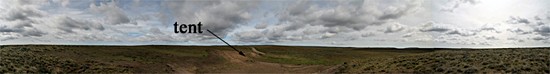 ’s Middags tegen een uur of zes hebben we 35 kilometer afgelegd en geven we het gevecht tegen de sterke westenwind op. In de luwte van een aantal bomen zetten we de tent op. Extra stevig met veel haringen.