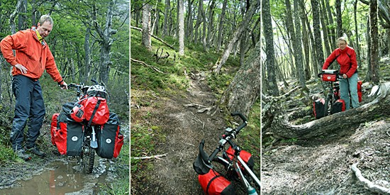 Het is dan ook begrijpelijk, beste lezer, dat het team zeer verbaast reageert als het erachter komt dat na twee kilometer niet de douanepost, maar slechts de grensovergang tussen Chili en Argentinië bereikt is (stippellijn op het kaartje). Zwaar teleurgesteld vervolgt het team de weg, die na de stippellijn niet meer blijkt te zijn dan een bospad. Prima voor rugzaklopers, maar niet geschikt voor fietsen met volle bepakking…