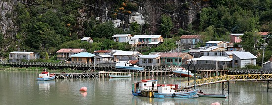 Maar dan wacht ons nog de grootste verrassing van die avond. Abrupt houdt de weg op en staan we op een grote parkeerplaats. Met verbazing staren we in de diepte naar een wirwar van trappen, steigers en houten huisjes die tegen de rotswand van een fjord aangeplakt lijken te zijn. Het lijkt wel een tekening van Escher. De moed zinkt me in de schoenen. Waar moeten we beginnen met het zoeken naar een hotelletje! Bij het informatiehuisje hangt geen plattegrond en ik zie in eerste instantie ook geen borden die naar een ‘hospedaje’ wijzen. Gelukkig heeft Eric meer moed. Hij stapt gewoon een steiger op en begint te lopen en verdwijnt uit zicht.